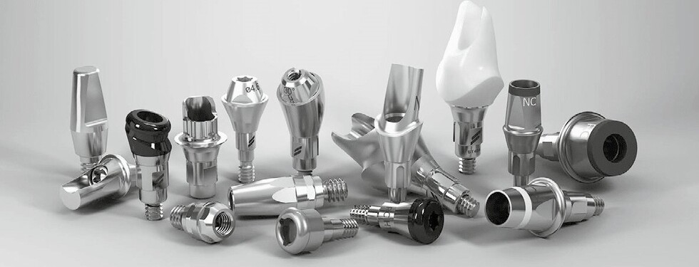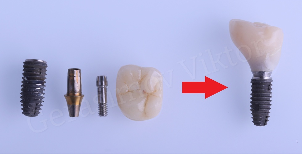 Слева-направо: шуруп(имплант), переходник, винт и зуб(коронка)