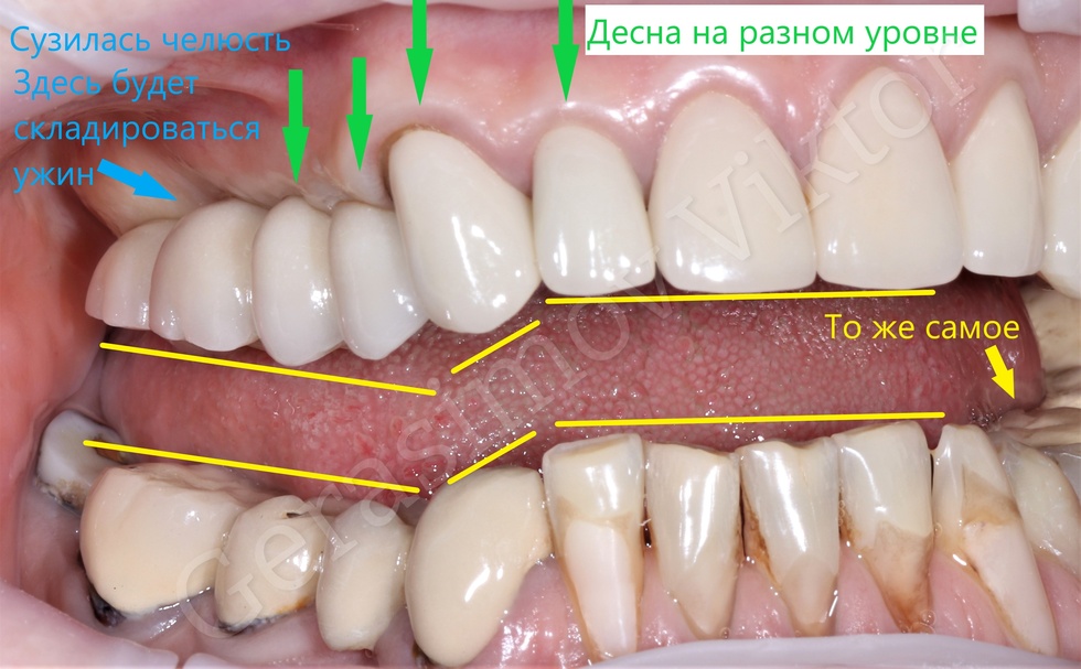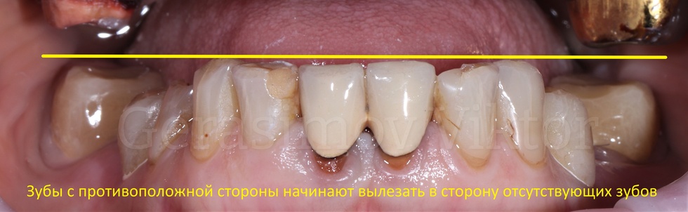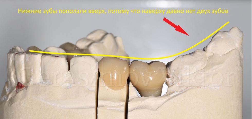 При улыбке не видно, правда же?) Ну и отлично! Строим дачу, покупаем машину, квартиру, айфон, едем на море…Проходит несколько лет. Человек жуёт на одной стороне, зубы с которой могут начать сыпаться из-за перегрузки либо просто шашлык становится не очень удобно есть с одной стороны челюсти. Возникает желание вставить зубы. Нижние зубы при этом уже повылезали наверх. Он приходит к стоматологу и тот ему делает новые правые боковые зубы…но нижние стали длиннее поэтому новые зубы сделали короче. Появилась ступенька.