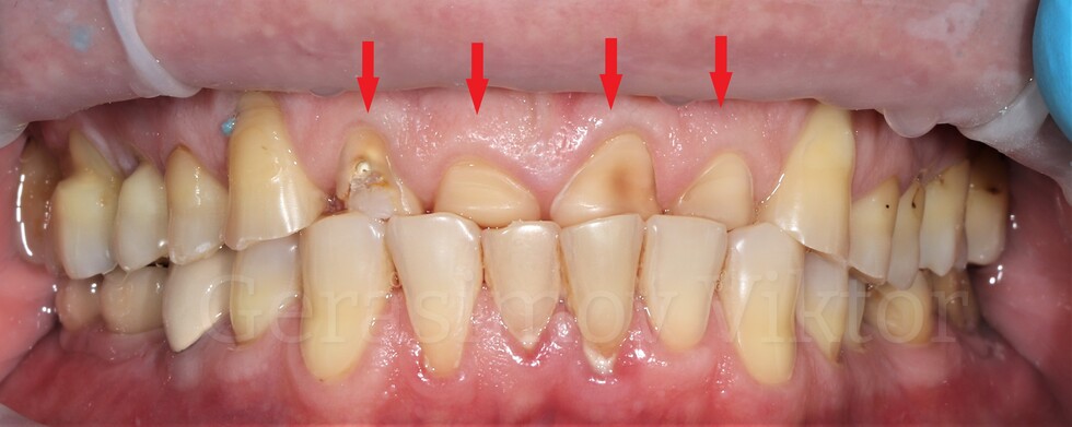 2) Либо воспаляются десны, из-за этого уходит кость вокруг зубов. Зубы хорошие, но они начинают из-за этого шататься и разъезжаться веерообразно в стороны.