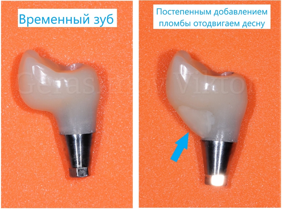 - временная коронка формирует вокруг себя десну. Десну можно коронкой отодвинуть в разные стороны, что увеличит визуально объём десны вокруг зуба + может даже сформировать новые десневые сосочки (уменьшится вероятность застревания пищи между зубами).